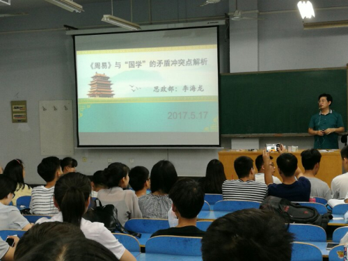 2017年5月17日晚间,思政部李海龙副教授在07A301教室,为我校学生和十多位老师(其中一位河南中医药大学老师)讲了“《周易》与国学的矛盾冲突解析”,受到听众的广泛认可和欢迎,掌声不断。