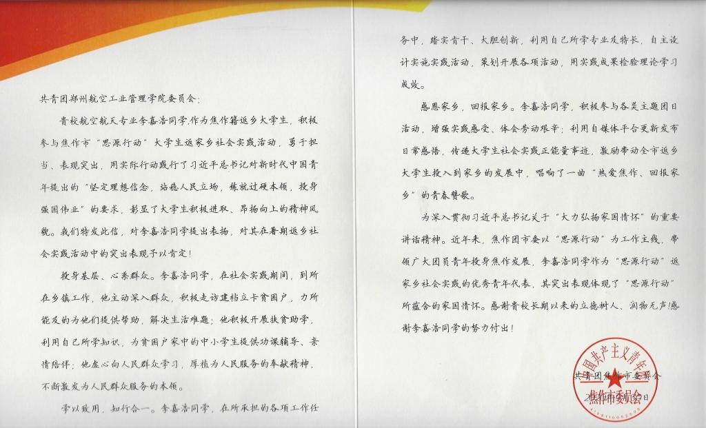 信中写道,我校航空工程学院2019级航空航天类专业学生李嘉浩,在暑期积极参加“返家乡”社会实践。