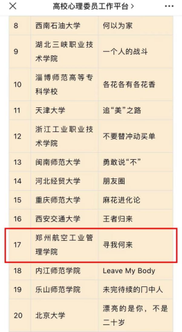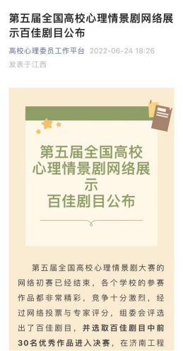 我校心理情景剧剧目首次参赛能跻身全国高校百佳剧目是对我校心理情景剧大赛这一品牌心理活动开展成效的肯定,也为我校继续参赛积累了经验,奠定了良好的基础。我校将持续开展丰富的心理宣传教育活动,以心理情景剧为载体,在积极心理健康教育视角下进一步提升我校师生的心理健康水平,发展人人关注心理、人人维护心理的全员全程育人新模式。