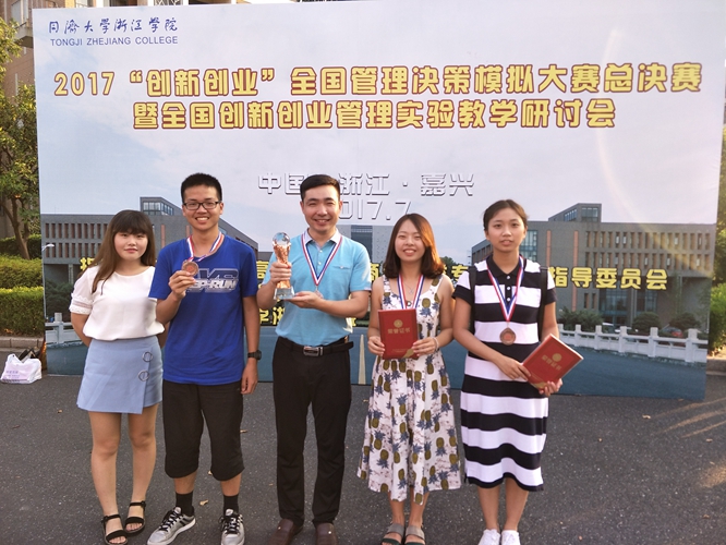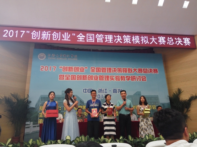 “2017创新创业杯全国管理决策模拟大赛”启动以来,北京大学、清华大学、上海交通大学、浙江大学、中山大学、武汉大学、广西大学、深圳大学等全国近900多所高校积极响应,参赛队伍四万余支,总人数达十万人,经过校内初赛、大区复赛、全国半决赛层层考验,最终包括我校在内的全国90余所高校的96支队伍获得了晋级全国总决赛资格,在同济大学浙江学院进行了最终的巅峰对决。