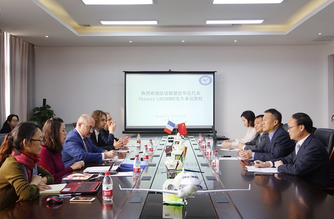 签约仪式上,杨培向卢思和先生介绍了我校的历史沿革及学科专业发展,回顾了两年多来学校为积极申办法语联盟做出的努力。他说,郑州航院自2015年初申请与法语联盟的合作以来,积极参加和承办法盟及其使馆在华举办的各项文化交流活动,先后有前任法语联盟驻华总代表、青岛及西安中法方校长、法国驻华使馆文化副参赞、高等教育署中国总协调员、欧华商拓公司代表等多位中、法教育界的专家学者来校考察并洽谈合作事宜。