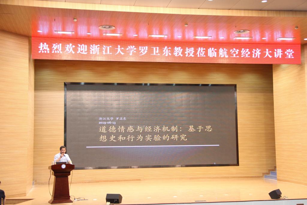 座谈会结束后,罗卫东在航空经济大讲堂作了题为“道德情感与经济机制:基于思想史和行为实验的研究”的学术报告。罗卫东从“什么是好的经济制度”的讨论引出报告会的主题“道德情感与经济机制”,通过回顾古典市场经济机制的原理,探讨了理想市场机制有效作用的条件;基于组织行为实验和道德情感的研究,罗卫东给出了经济机制设计和政策设计的新学理、新方法。