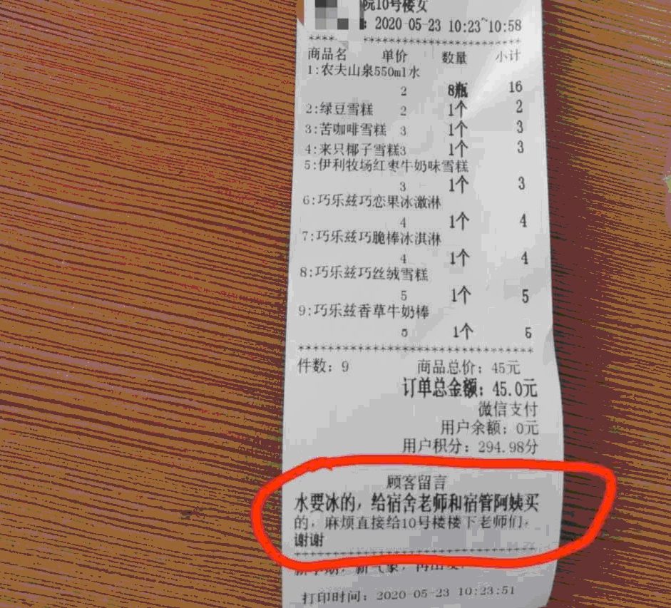 “水要冰的,给宿舍老师和宿管阿姨买的。麻烦您直接送给10号楼楼下的老师们。”直到无意间看见付款凭证上的留言,牛俊玲才意识到,这是10号楼第一位离校学生,特意从校园超市为她们点的外卖。