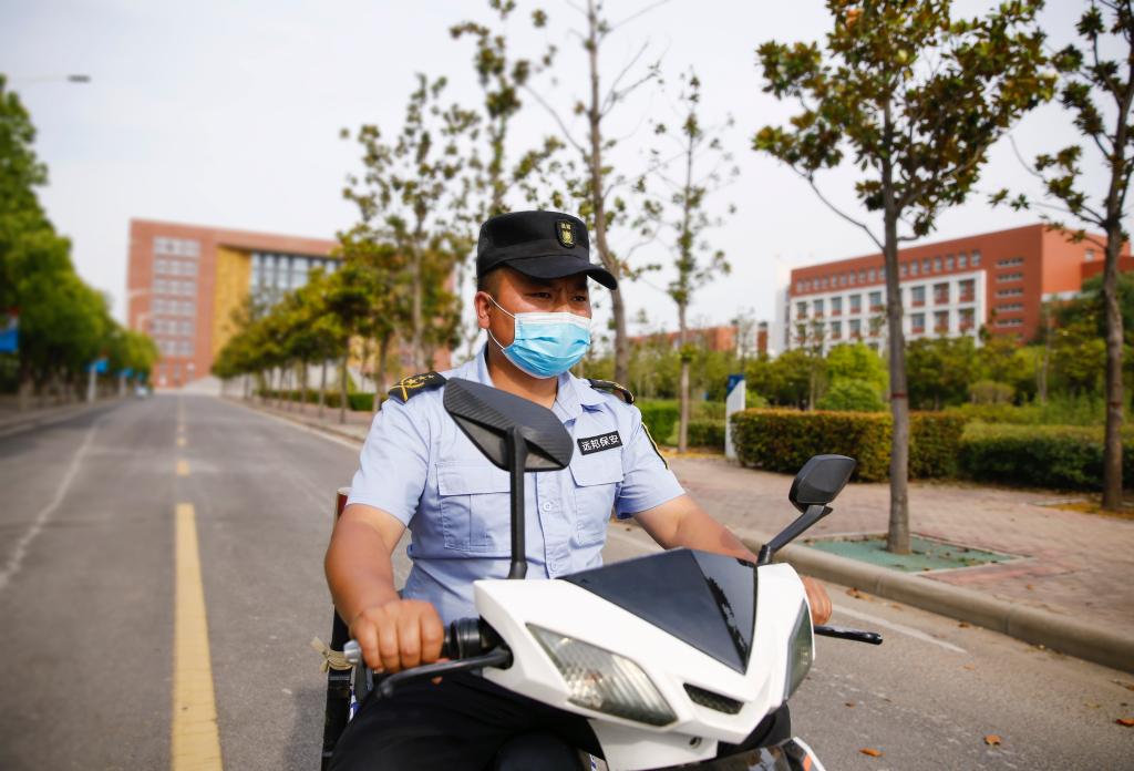 在道路上,保安员不停地巡逻,一遍又一遍地提醒走在路上的同学戴好口罩、保持距离。