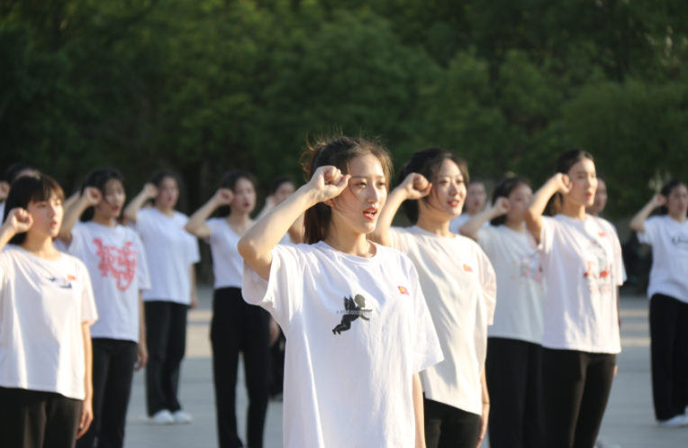 民航学院合唱团在中心广场合唱红色歌曲《十送红军》《保卫黄河》,百名师生党员共同演绎《我们都是追梦人》舞蹈,并重温入党誓词,表达师生对党的百年华诞的深情祝福。