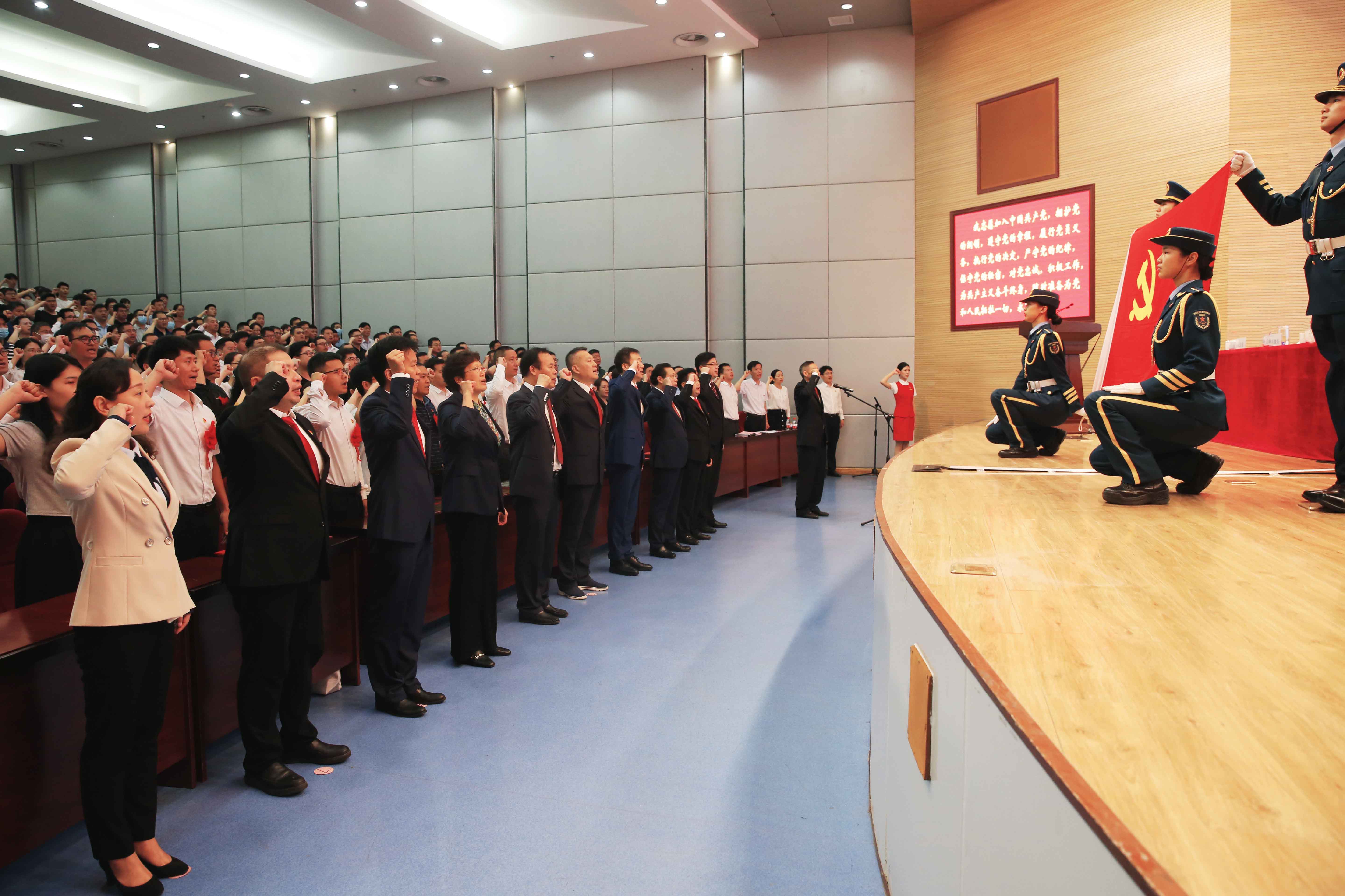 大会现场,面向鲜红的中国共产党党旗,校党委副书记余传杰带领新党员入党宣誓、老党员重温入党誓词。