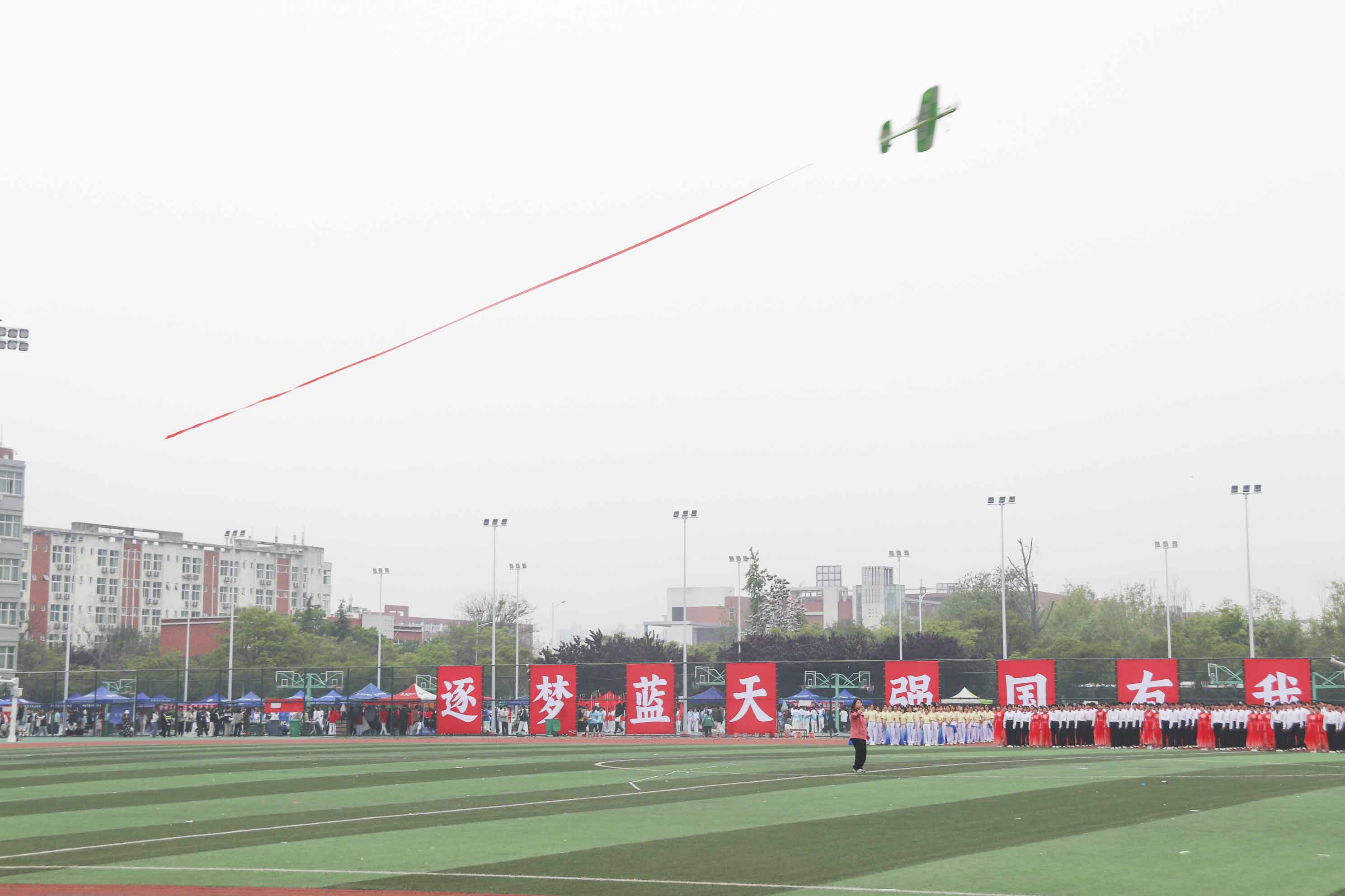 节目展示环节,航模表演率先登场,河南省重竞技航空运动中心航空模型项目团队先后带来线操纵特技飞行、固定翼四机空战、手操遥控滑翔机飞行、直升机遥控花式特技飞行等表演,航模腾空而起,在体育场上空盘旋、俯冲、翻转、追逐,一组组高难度操作干净利落,惊艳全场。多旋翼无人机将“运动激扬青春,奋斗成就梦想”的条幅高高悬起,随风展开,在蓝天映衬下格外醒目。千余名手持彩旗的同学随即奔向操场中央,彩旗翻飞,队列变化,定格为“空天ZUA”字样与一架蓄势起飞的飞机造型。随着场上曲风转换,华尔兹集体舞蹈登场,红裙飞扬,舞步轻盈,为赛场添了几分柔美。压轴的是舞扇团体表演,300名学生挥动蓝色舞扇,扇面开合,层层铺展,如云海翻涌,喝彩声与鼓点声交织,看台上掌声与呐喊声久久不息。