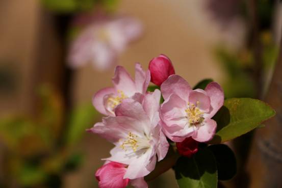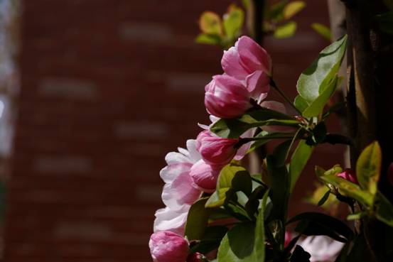 海棠花语:海棠花明艳好看,有“花贵妃”之称,别名“解语花”。因“棠”与“堂”同音,在与玉兰花、牡丹花、桂花搭配在一起时,寓意“玉堂富贵”;与菊花、蝴蝶相配,寓意“捷报寿满堂”;与五个柿子相配时,又寓意“五世同堂”。