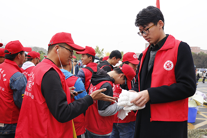 仪式结束后,身着红色志愿服、头戴小红帽的教师和学生在雨中手持工具,相互协作,进行了有序清扫。 (新闻中心 李绍巍 大学生记者  刘晓艺  大学生实习记者 汪程斌  刘晨红