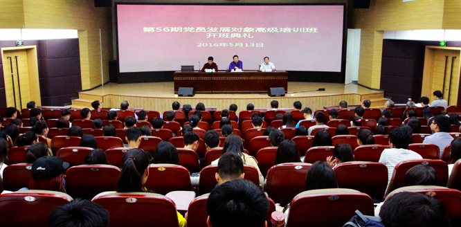 ,我校第56期发展对象高级培训班开班典礼暨首场党课辅导报告会在东校区图书馆第二报告厅举行。党校校长、党委副书记闫纪建出席,党校、各分党校主要负责同志及来自各学院的培训班学员代表参加了开班典礼。典礼由校党委委员、党委组织部部长杨海强主持。