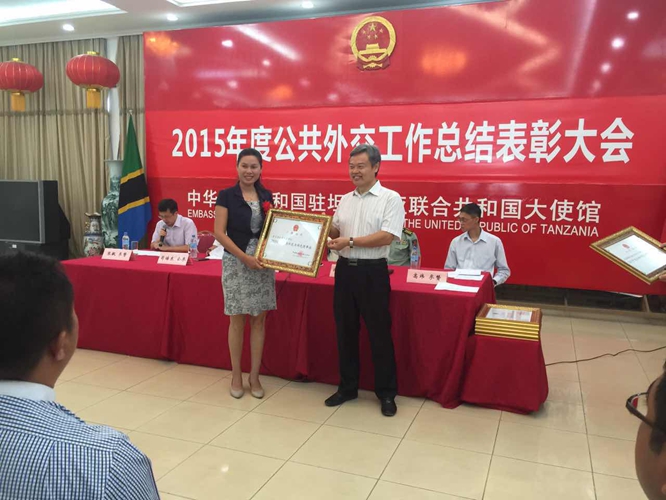 坦桑尼亚当地时间327日上午,在中国驻坦桑尼亚大使馆召开的“2015年度公共外交工作总结表彰大会”上,多多马大学孔子学院荣获“公共外交工作先进单位”,“华人在坦桑”微信征文“最佳组织奖”等多项荣誉称号。