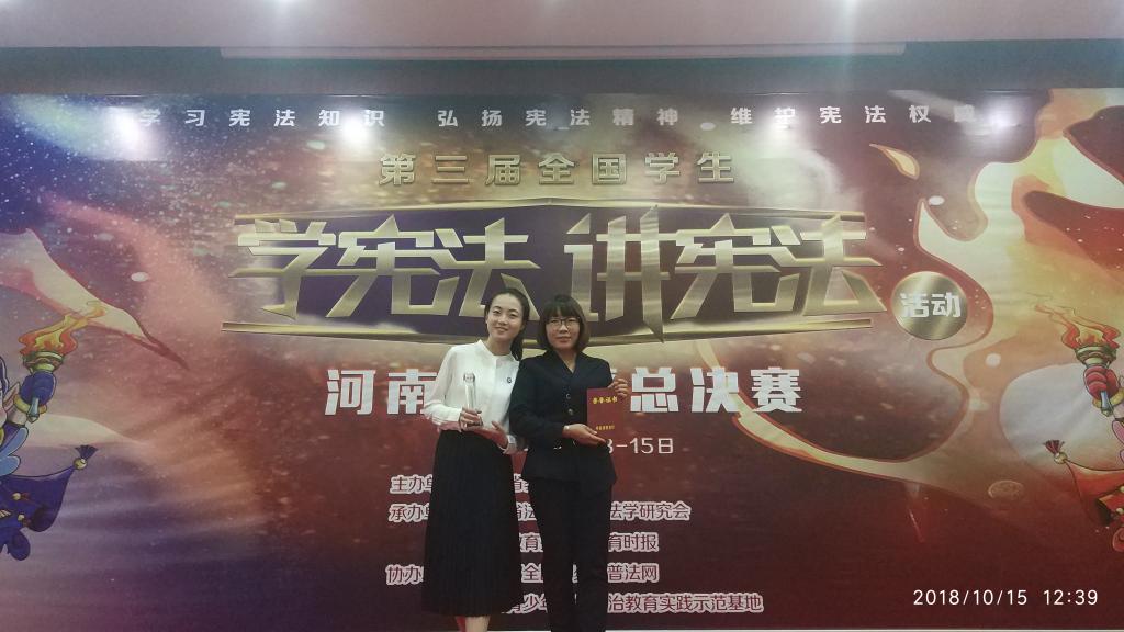 10月14-15日,河南省第三届“学宪法 讲宪法”演讲大赛决赛在郑州举行。我校法学院学生田雅囡荣获特等奖,法学院教师王娟娟被评为“优秀指导教师”。