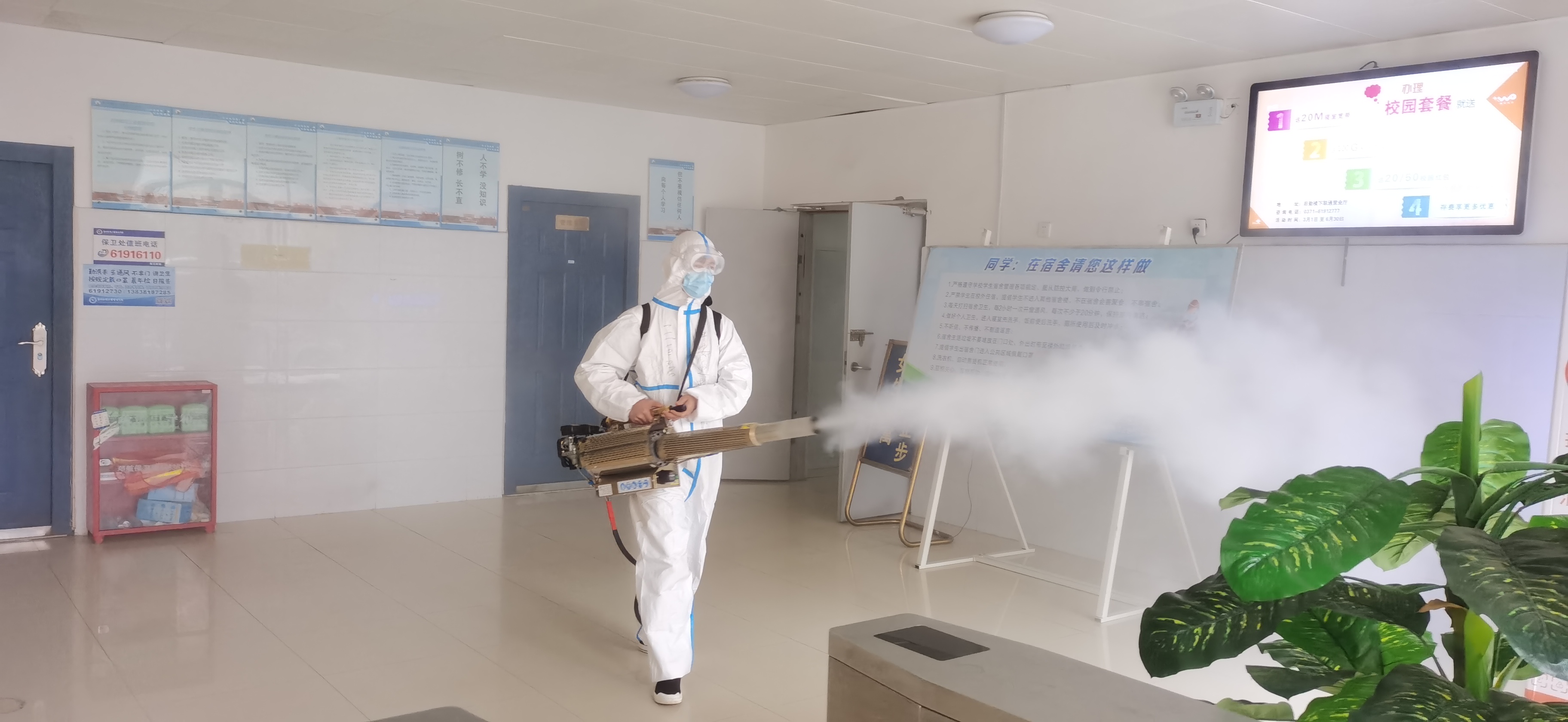 为确保学生返校后的学习生活安全有序,后勤管理处联合郑州市“蓝天救援队”派驻的志愿服务队,在学生返校前对校园、实验楼、教学楼、图书馆、学生公寓及各公共区域进行全面病毒消杀。