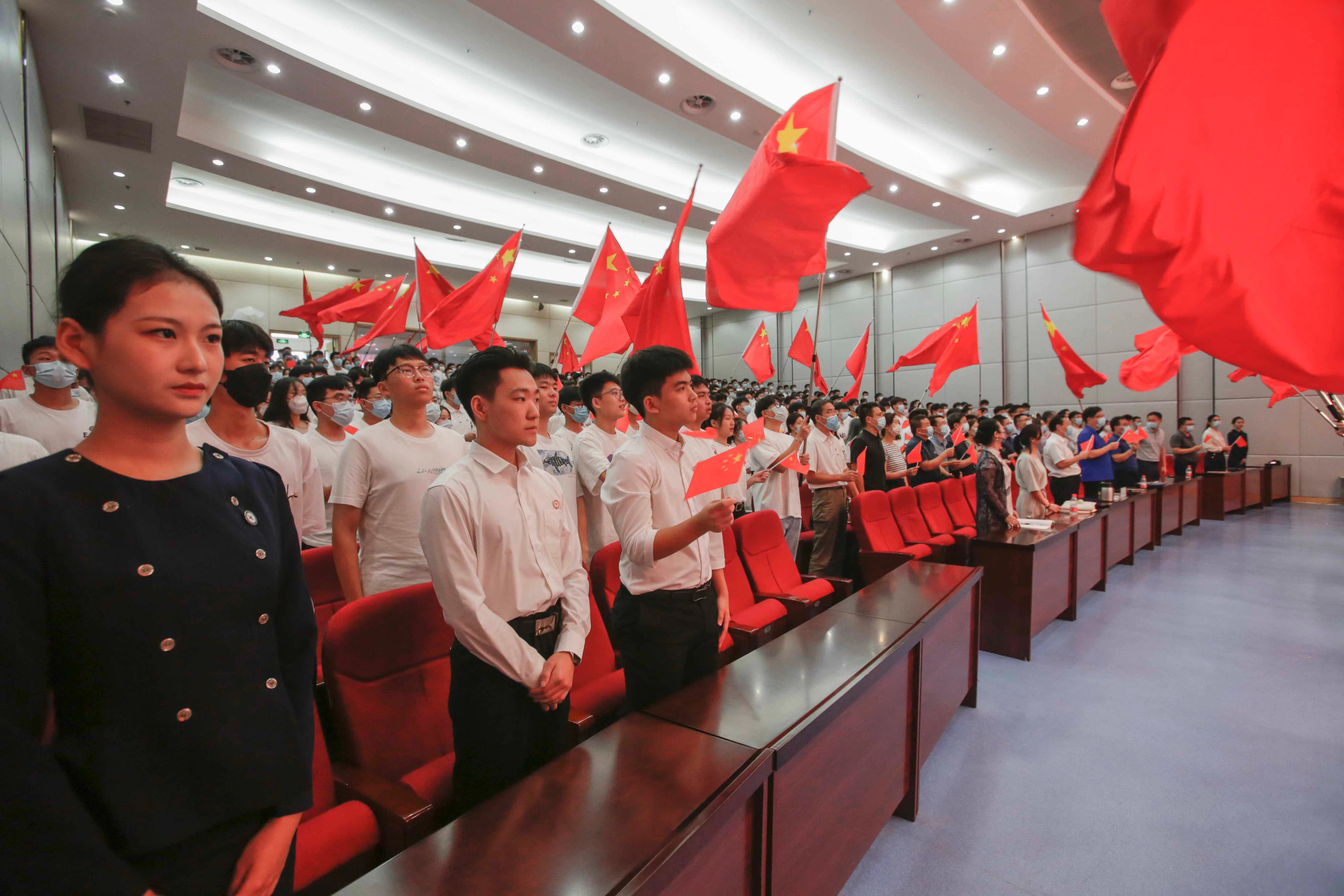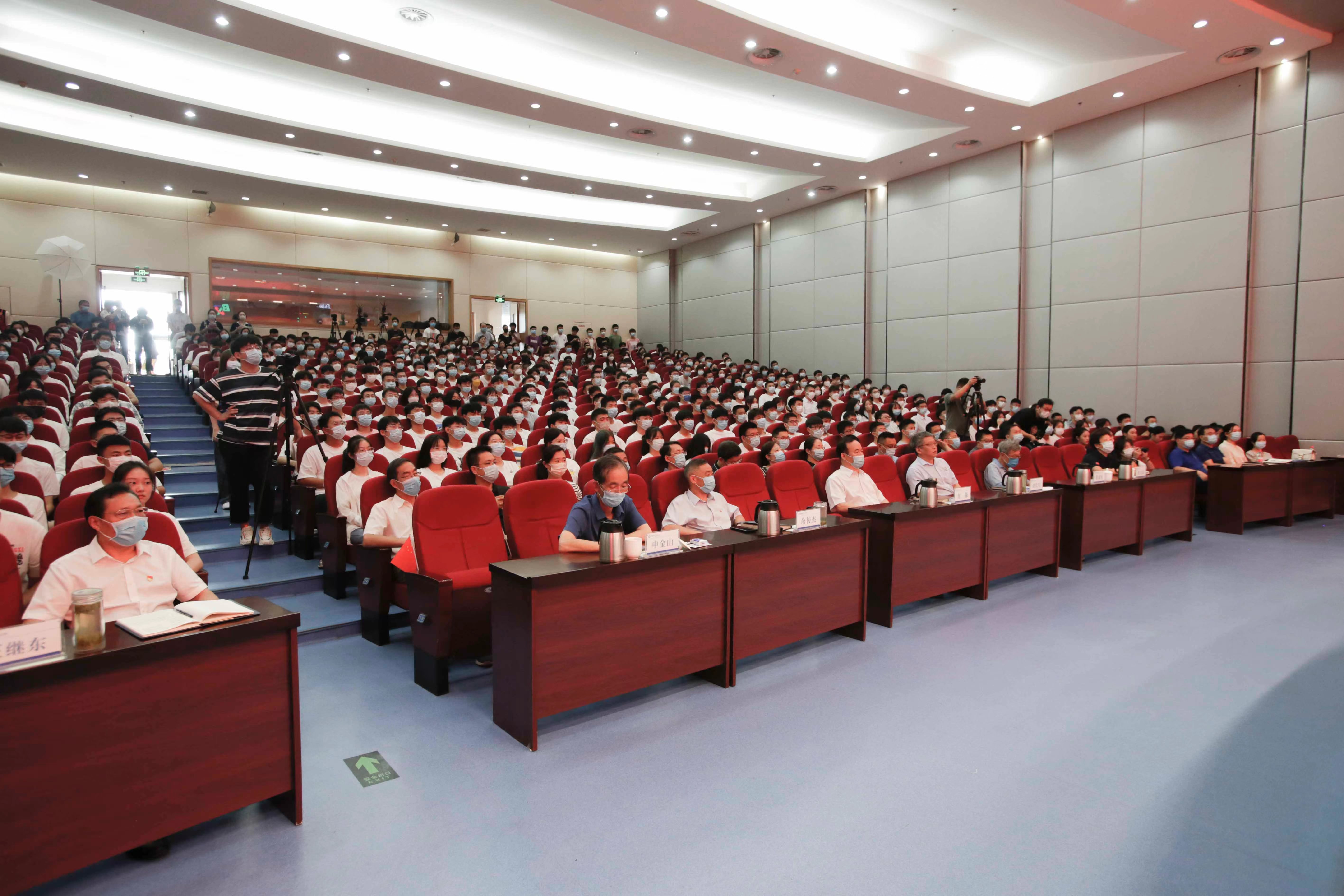在校校领导付强、刘代军、余传杰、费斌军、申金山、张文强、王继东及党委各部门负责人、各二级学院党委书记、学生辅导员、全体新生近万人分别在主会场和分会场共同聆听“开学第一课”。