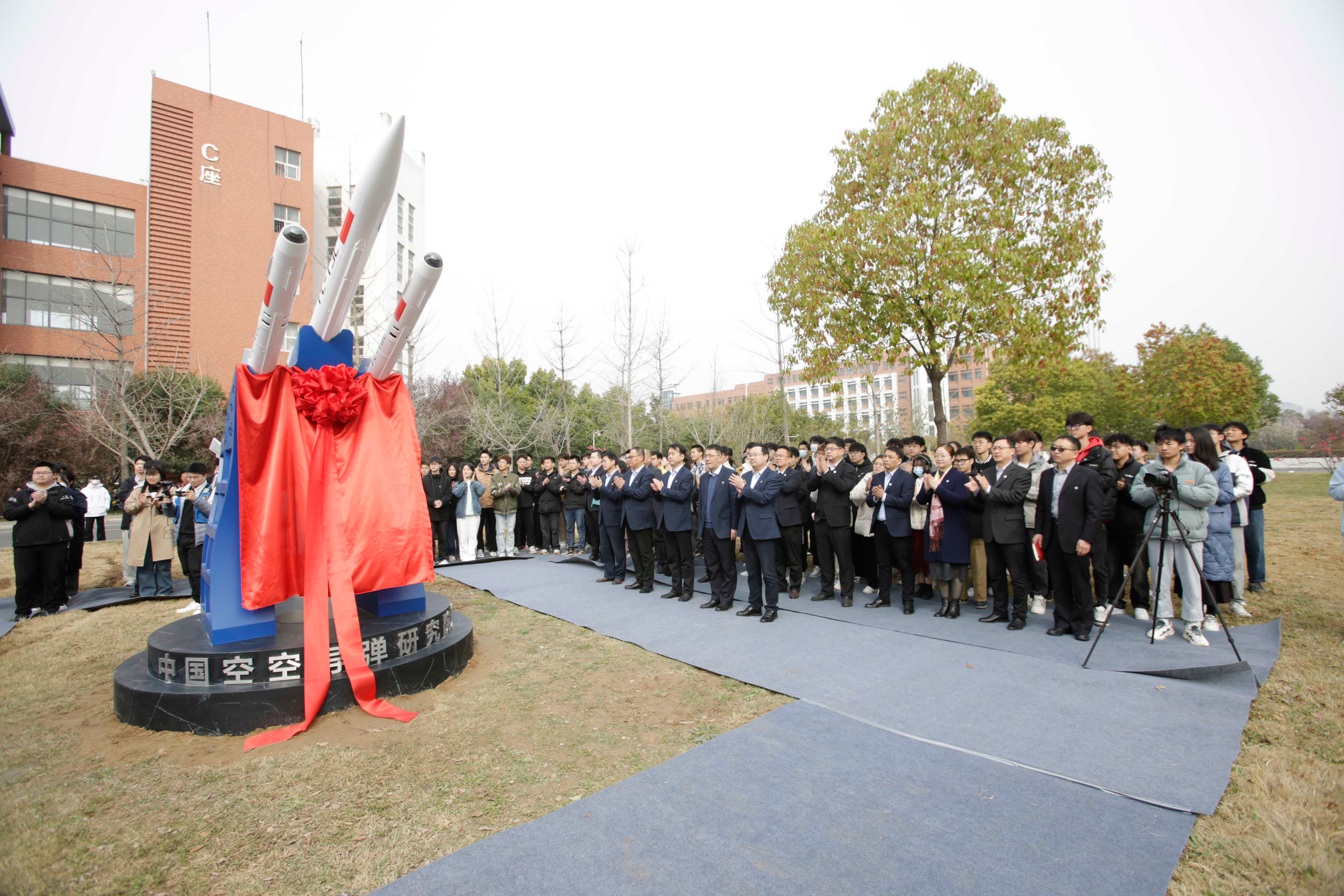 落成仪式上,中国空空导弹研究院党委书记张海强、总设计师崔颢和我校党委书记付强、校长刘代军,共同为主题雕塑“航威威”落成启幕。