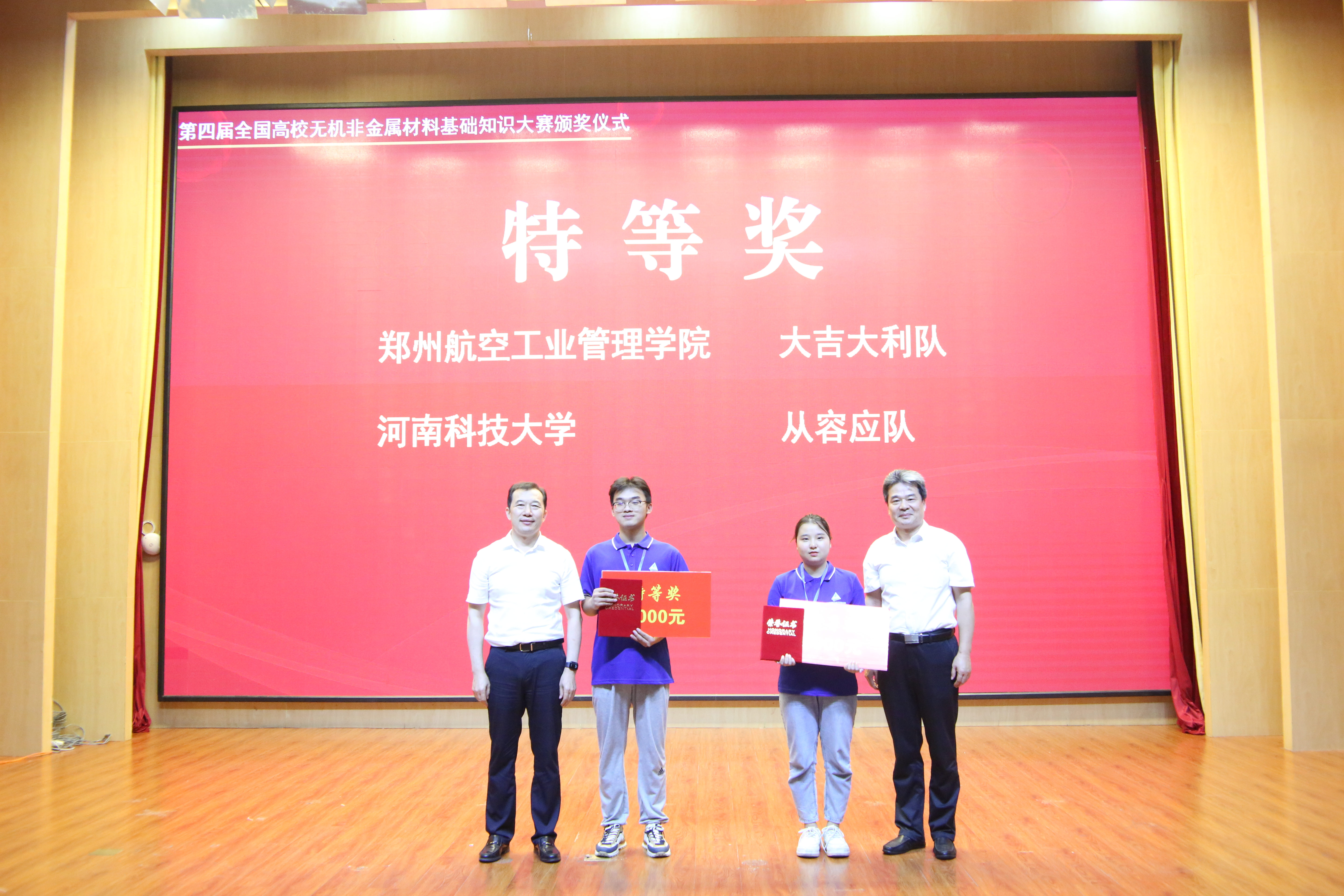8月16—18日,第四届全国高校无机非金属材料基础知识大赛在洛阳举行。我校材料学院学生孙宇洁、吴国玺、冯千惠、郝嘉伟组成的参赛队荣获全国特等奖(第一名),祝薪铠、齐章顺、李温馨、王琼瑶组成的参赛队荣获全国一等奖(第四名)。