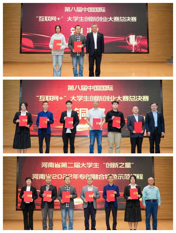 刘代军、程骄杰等为第八届中国国际“互联网+”大学生创新创业大赛总决赛银奖和铜奖获奖师生、2022年河南省专创融合特色示范课程负责人、河南省第二届大学生“创新之星”颁奖,表彰他们在学校创新创业教育工作中作出的突出贡献。