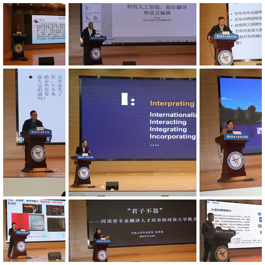 论坛中,中国翻译协会对外话语体系研究委员会副主任、全国翻译专业学位研究生教指委专家委员会委员杨玮斌,北京航空航天大学外国语学院院长梁茂成和教授文军,北京外国语大学外国语学院副院长李长栓,河南省翻译协会副会长、上海外国语大学语料库研究院教授韩子满,西北工业大学外国语学院教授智慧,南京航空航天大学外国语学院教授范祥涛,中国民航大学外国语学院院长张艳玲,河南大学外国语学院院长张璟慧,以及上海一者信息科技有限公司总经理张井等专家学者,分别围绕翻译职业规划与设计、人工智能与外语教育、航空航天翻译研究、翻译语料库、翻译教材编写、民航特色翻译人才培养等主题先后作主旨发言。