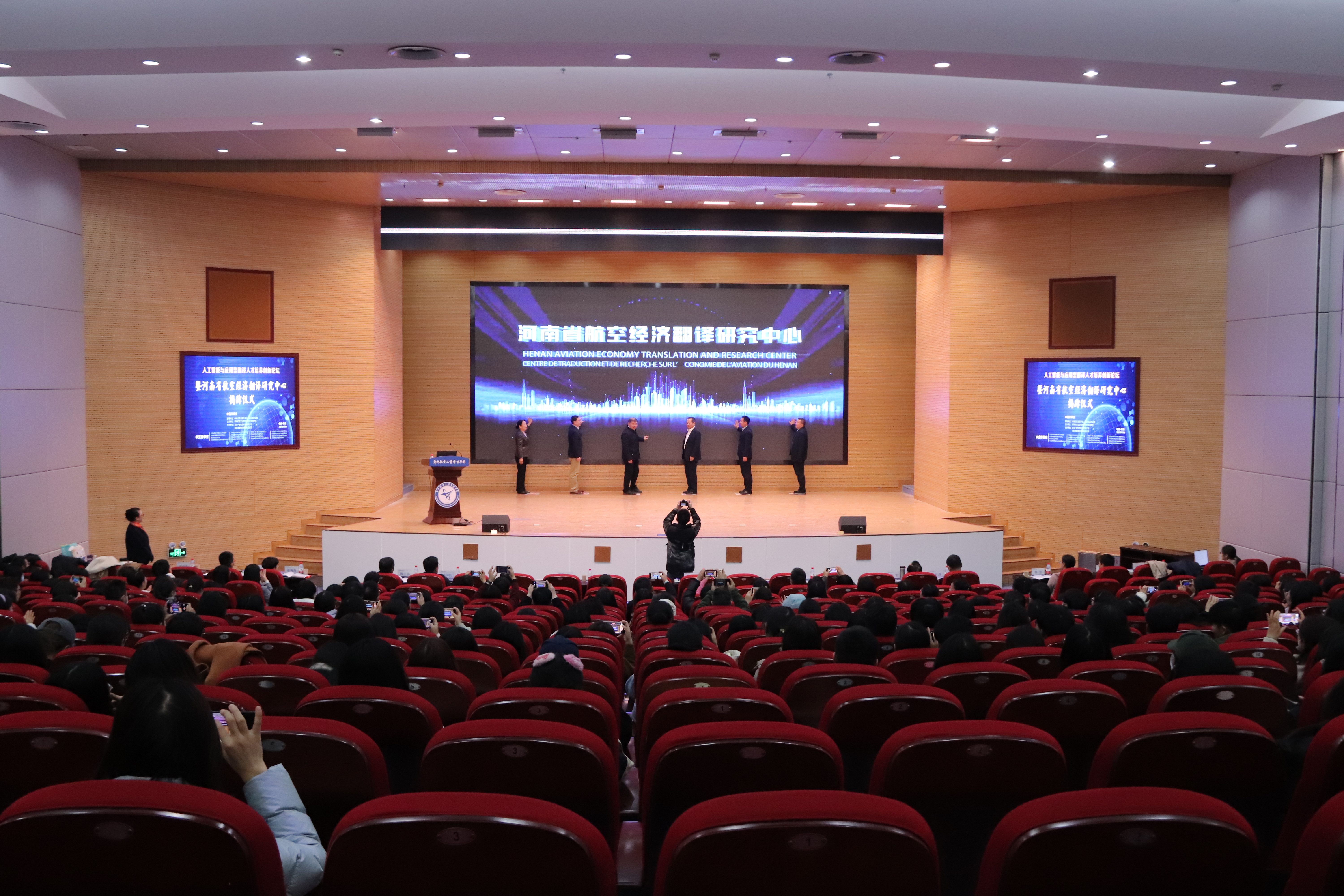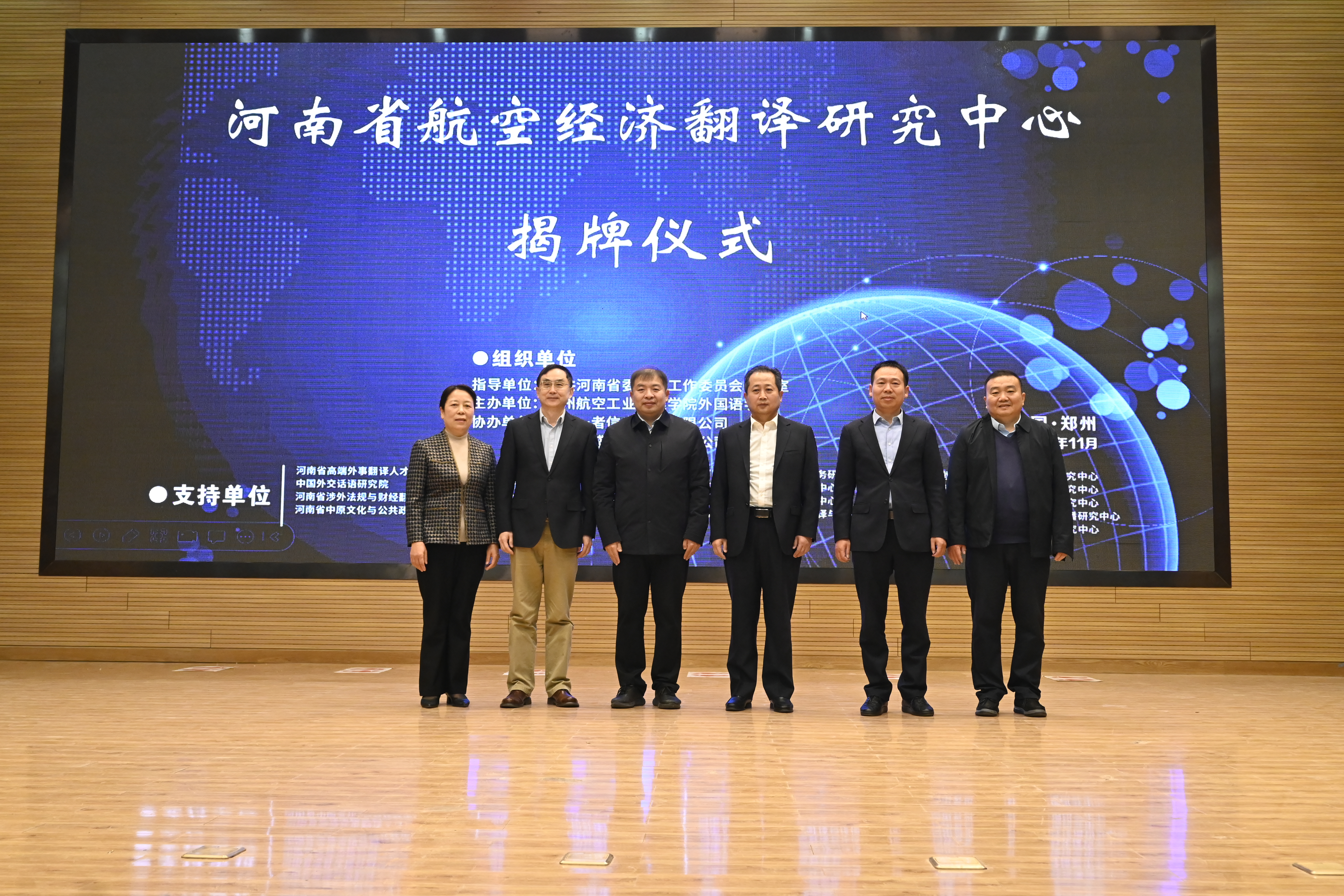 省委外办副主任李冰、副校长李捷、中国翻译协会对外话语体系研究委员会副主任兼全国翻译专业学位研究生教指委专家委员会委员杨玮斌、我校国际交流与合作处处长王国保、外国语学院党委书记许峰、外国语学院院长郭银玲共同为“河南省航空经济翻译研究中心”揭牌。